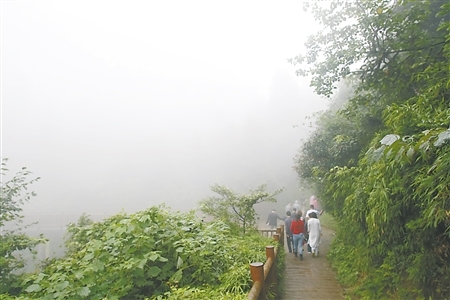 飞云口的奇景真可谓是“人在天边走,云从地底来。”然而这只是摩围山美景的一角。工作人员说,还有天坑、石林和时空隧道等众多景观。
